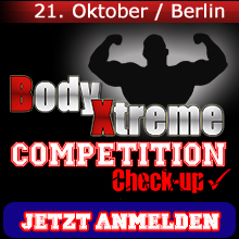 Zusätzlich zu ihrem Probelauf für die Wettkampfbühne können die Teilnehmer ein kostenloses Fotoshooting absolvieren, und es winken zahlreiche Preise. Nicht zuletzt können sie über das BX-Portal und die SPORTREVUE deutschlandweit auf sich aufmerksam machen. Die Premiere des „BX Competition Check-ups“ findet am 21. Oktober 2011 im Bühnensaal des Freizeitforums Berlin-Marzahn statt. Als Juroren konnten die Bodybuilding-Kompetenzen Markus Becht, Andreas Frey und Birk Luther sowie der neue Deutsche Strongman-Meister Patrik Baboumian verpflichtet werden. Wer sein Potenzial für das kommende Jahr einschätzen lassen will oder für seinen Bühnenauftritt in der Herbstsaison den letzten Feinschliff benötigt, der sollte sich jetzt auf www.body-xtreme.de anmelden und „durchchecken“ lassen.